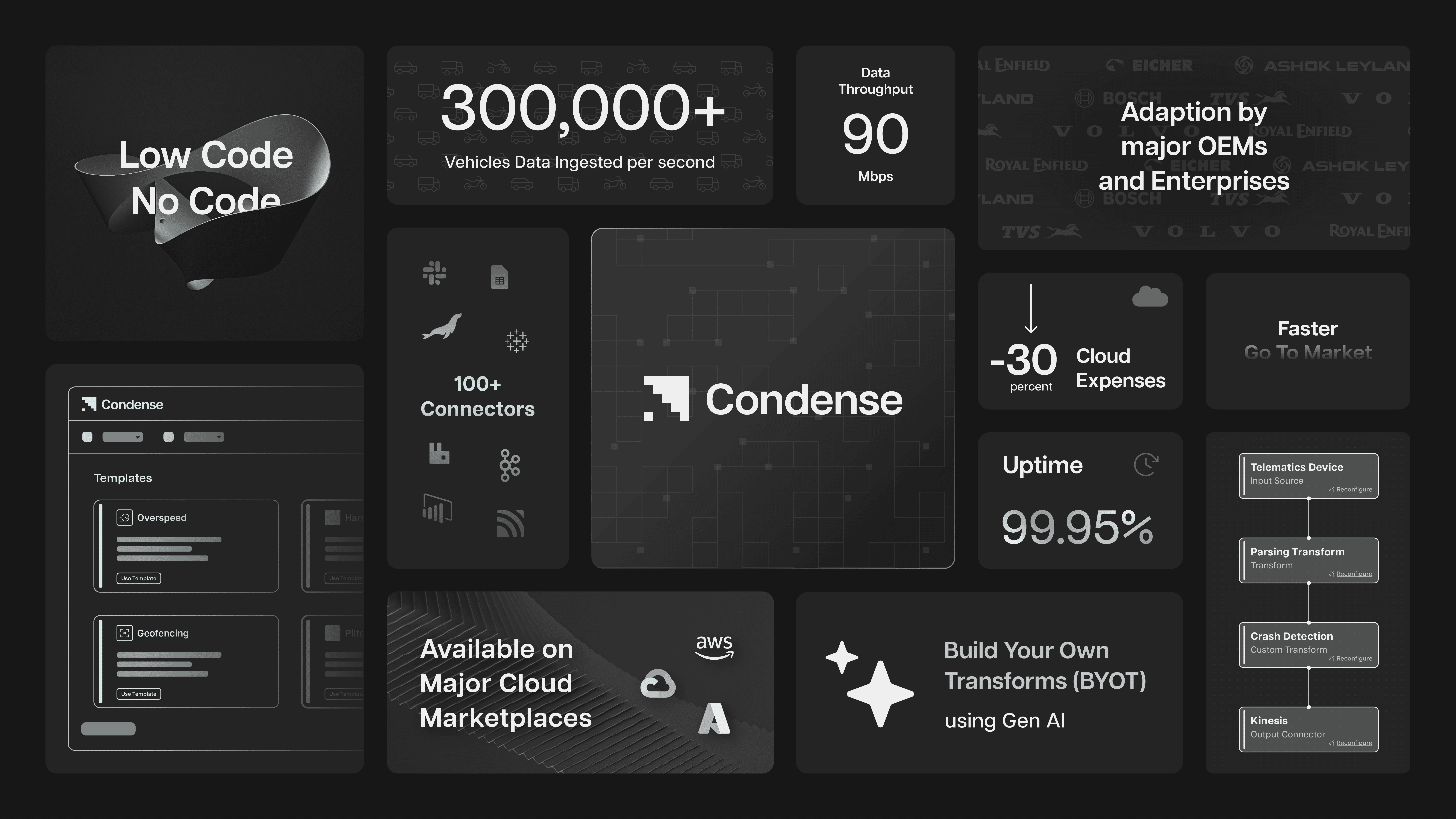 Zeliot's expertise in mobility offers specific advantages through its innovative platform, empowering users to efficiently build and manage data pipelines from diverse automotive data sources. Condense seamlessly integrates with brokers, databases, IoT sensors, and telematics devices, effortlessly handling heterogeneous data streams. Pre-built connectors and production-ready pipelines streamline data ingestion and transformation, saving valuable time and resources, thereby enabling Automotive OEM and Enterprises a faster go-to-market (GTM).