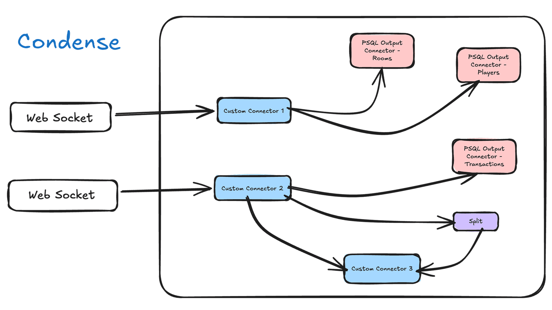 Made a smooth multiplayer game setup in Condense. React front-end keeps players in sync using Kafka (7 topics). Custom apps handle rooms, players, transactions, and fraud checks. Database connectors save the data, and a splitter checks transaction amounts before sending them on. Websockets update everyone live. No server costs, easy to fix issues. Try the demo: play now.
