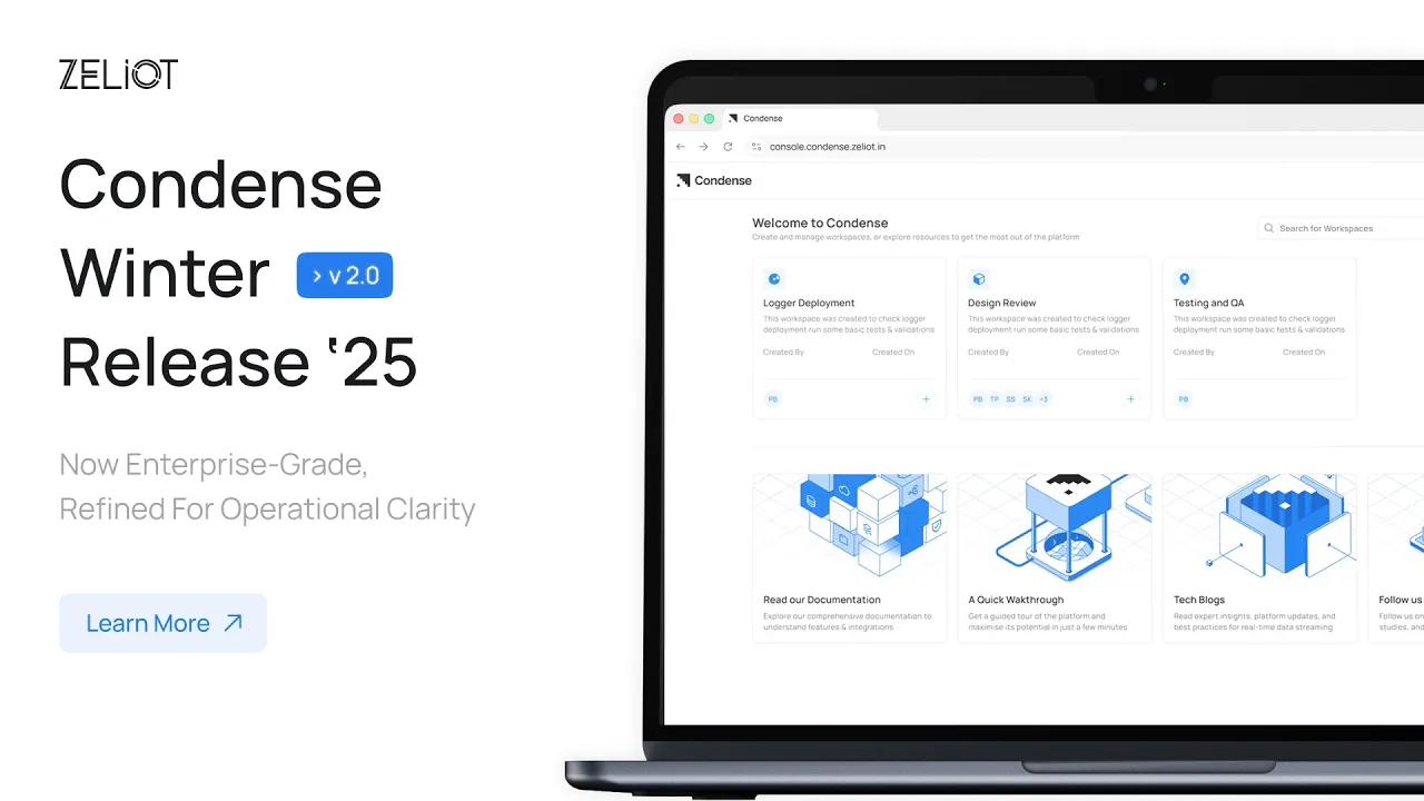 The winter release, Condense 2.0, is here! Condense is the ultimate real-time data streaming platform with fully managed Kafka, intuitive Pipeline Canvas, and enterprise-grade RBAC for seamless data pipelines. Dive into this winter release deep dive by Zeliot's COO, Sudeep Nayak and CIO, Sugam Sharma, covering everything from Custom Transform Framework (CTF) to industry-specific connectors for Volvo, MAN, Daimler, and Scania telematics.